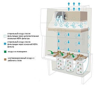 • равномерный, ламинарный, однонаправленный поток воздуха поступает на рабочую поверхность со скоростью 0,32 м/с и минимизирует кросс-контаминацию;