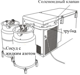 Принцип работы: в случае повышения/понижения температуры в камере морозильника относительно заданной автоматически включается back-up система – в камере морозильника открывается клапан, через который впрыскивается азот. Таким образом, температура в камере поддерживается на уровне примерно –135 °С. Время поддержания температуры – примерно 24 часа при объеме азота в сосуде Дьюара 100 л.