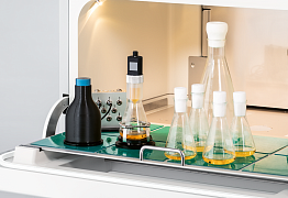 Сенсорная пластина доступна для различных объемов колб. Располагается под колбой в шейкере-инкубаторе и измеряет биомассу неинвазивно.