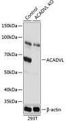Вестерн-блот-анализ экстрактов нормальных (контрольных) и нокаутных по ACAD9 (KO) клеток HeLa с использованием антитела к ACAD9 (A19942) в разведении 1:1000. Вторичное антитело: HRP Goat Anti-Rabbit IgG (H+L) (AS014) в разведении 1:10000. Лизаты/белки: 25 мкг на дорожку. Блокирующий буфер: 3% обезжиренное сухое молоко в TBST. Обнаружение: базовый комплект ECL (RM00020). Время экспозиции: 1с.