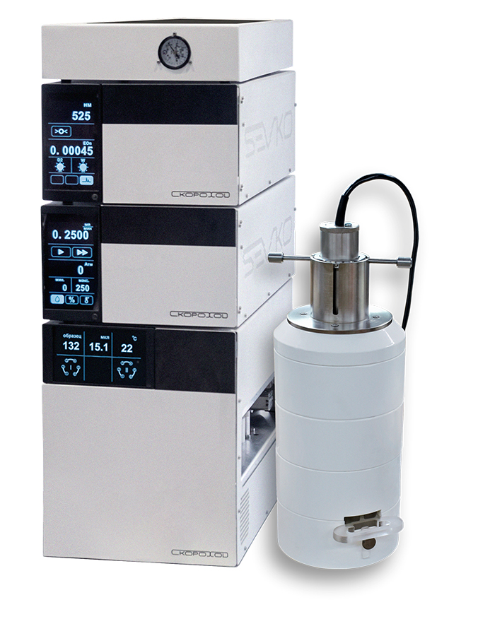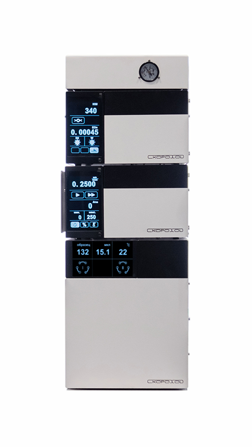Эта система обеспечивает высокую точность и надежность результатов, что делает её незаменимым инструментом для специалистов в этих областях. ВЭЖХ "Скороход" — первая в России компактная модульная система, которая включает в себя: Насосы серии НЖХ-1000. Эти насосы способны работать при максимальном давлении 650 бар в исполнении из нержавеющей стали SS 316 и 350 бар в инертном варианте. Они оснащены двойными входными обратными клапанами, что предотвращает «залипание» клапанов при использовании 100% органических растворителей. Насосы НЖХ-1000 могут работать с двумя типами градиентов в зависимости от конфигурации: четырех градиентный со смешиванием на низком давлении и бинарный градиент со смешиванием на высоком давлении. Дегазацию обеспечивает вакуумный дегазатор мембранного типа с пятью камерами (серия ДМВ-1000), который устойчив ко всем органическим растворителям. Компактность системы дополнительно достигается за счет интегрированного термостата для колонок, который поддерживает температурный режим от -10 °C до +100 °C и вмещает до четырех колонок длиной 300 мм. Автоматический дозатор образцов серии АДХ-1000 представляет собой автодозатор прямого дозирования, который осуществляет ввод пробы через иглу с помощью дозирующего клапана и встроенного инжекционного порта. Это решение минимизирует перенос пробы и перекрестное загрязнение. Модуль АДХ-1000 также оснащен функцией термостатирования образцов в диапазоне температур от 5 °C до +60 °C. Стандартный объем петли для ввода проб составляет 100 мкл. Интерфейс — Ethernet 10/100. Поддон для бутылей — вместимость до 6 бутылей. Комплектация ВЭЖХ "Скороход": каждый модуль оборудован большим сенсорным экраном. Доступны следующие детекторы: спектрофотометрический, диодно-матричный, рефрактометрический, флуориметрический, светорассеивания, совместим с гамма-спектрометрический детектором "МУЛЬТИРАД-гамма" для ВЭЖХ с блоком детектирования БДКС-25-02-2А и свинцовой защитой СЗГ-17 для определения радиохимической чистоты и радиохимических примесей. В разработке кондуктометрический детектор. Программное обеспечение Мультихром