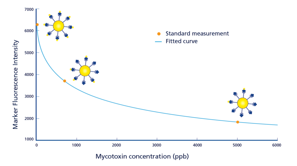 Рис. 5. Калибровочная кривая: чем сильнее флуоресцентный сигнал, тем ниже содержание микотоксинов в образце. |